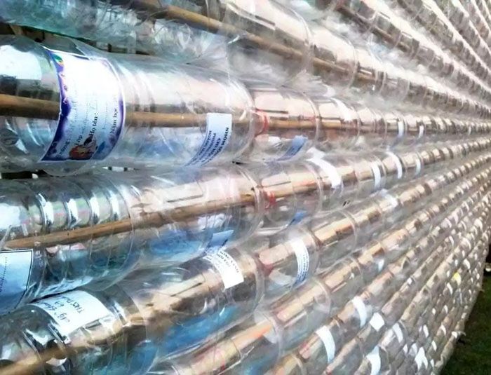 - Prin introducerea sticlelor strânse, acestea creează stâlpi de înălțimea dorită.