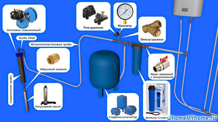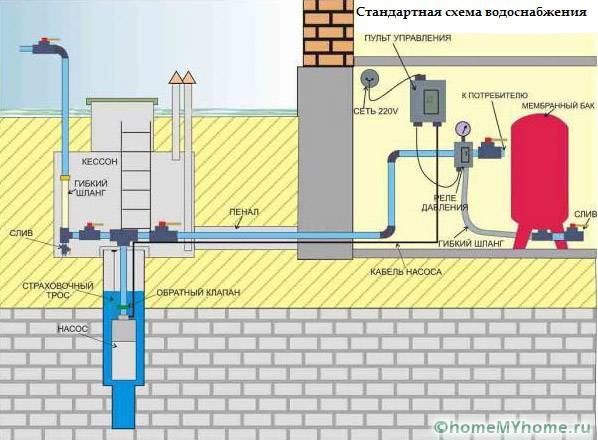 Dintr-o fântână sau altă sursă, apa este pompată în conducta principală. Pentru a preveni deplasarea acestuia în direcția opusă, este instalată o supapă de siguranță. Supapele de oprire sunt instalate în locurile potrivite. Este utilizat pentru întreținerea preventivă, reglarea, înlocuirea blocurilor defecte.
