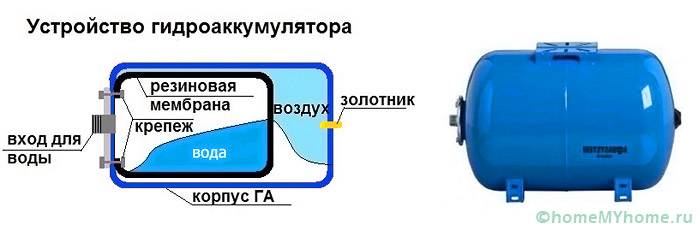 Principalul element de lucru al unui astfel de container este o partiție flexibilă. Dar presiunea inițială din rezervor în sine este creată de pompă. Cu echipamentul adecvat, acesta este controlat de la o telecomandă specială. Datele de la presostat pentru acumulator sunt primite acolo.
