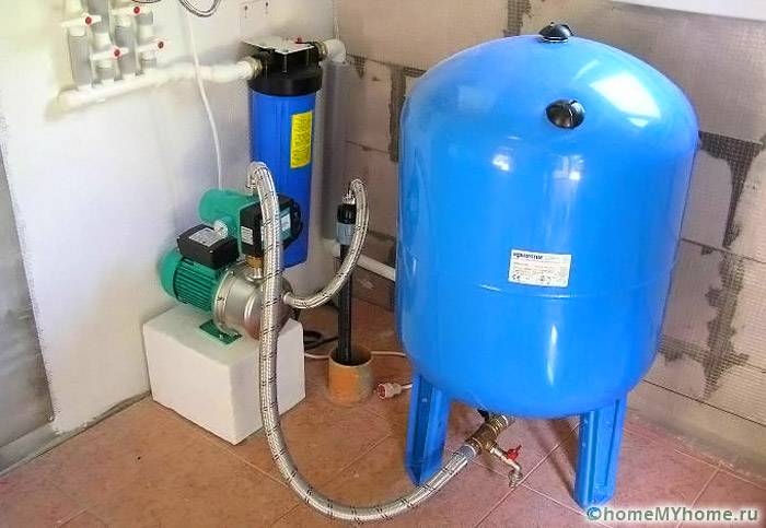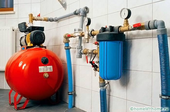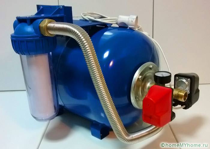 Această imagine arată un alt element important, filtrul de flux. Previne pătrunderea impurităților mecanice, deteriorarea releului și blocarea mecanismelor sale de acționare. Capacitatea crescută a rezervorului este utilă nu numai cu un consum zilnic ridicat. Acesta va reduce numărul de porniri / opriri ale pompei, ceea ce va avea un impact pozitiv asupra longevității și fiabilității sistemului.