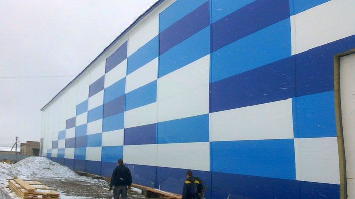 Използвайки сандвич панели от различни цветове, можете да внесете разнообразие в стила на дизайн на индустриален или друг строителен обект