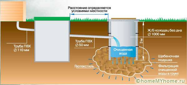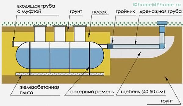 Полезен съвет! В повърхностното устройство можете да правите изводи от мивката, мивките и от тоалетната чиния. В зависимост от подземните артерии, контейнерът може да бъде заровен на определено разстояние.