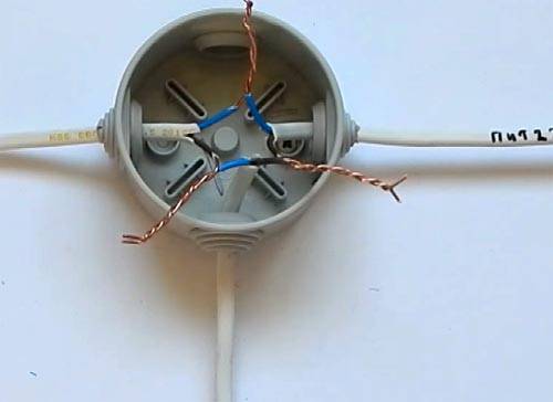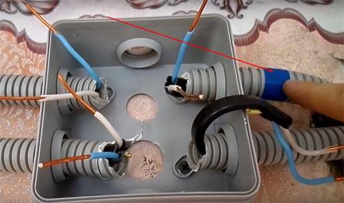 Вероятно след предишните обяснения окабеляването в разпределителната кутия не би трябвало да представлява проблем. Трябва само да се изясни, че 4 проводника ще преминат от него към блока "превключващ контакт" (нулев и фазов вход и 2 фази - изход към лампите).