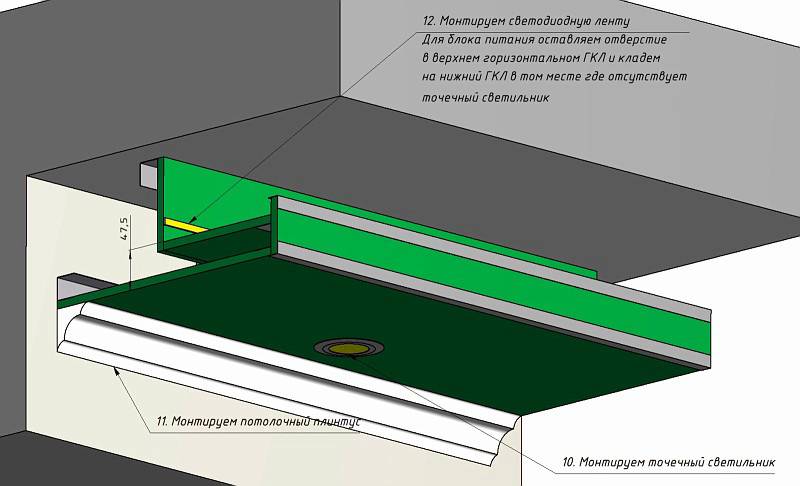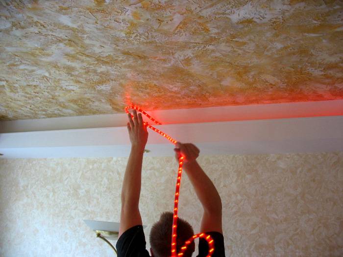 Полезна информация! Използването на осветление в таванната ниша ви позволява визуално да увеличите височината на стаята и да добавите пространство и обем.