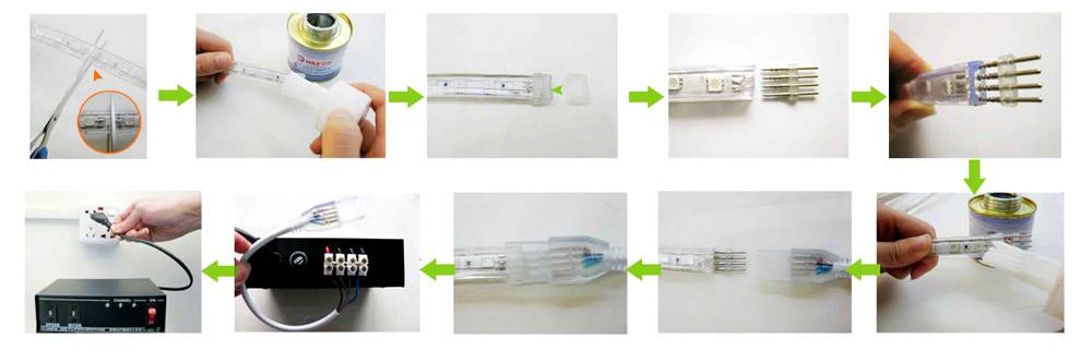 - проводниците на лентата и контролера са свързани чрез запояване, скоби или съединители.