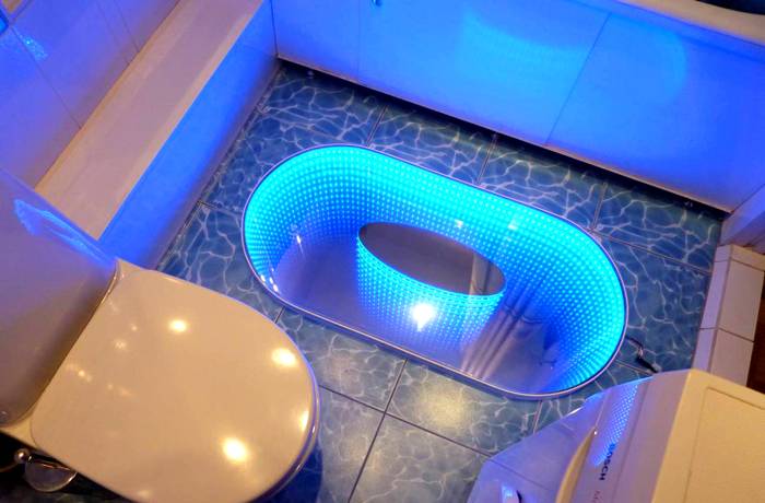 Осветлението в банята изглежда необичайно. В този случай можете да подчертаете тавани, стени и огледала. LED лентите могат да осветяват пространството пред огледалото или да бъдат монтирани зад огледалата.