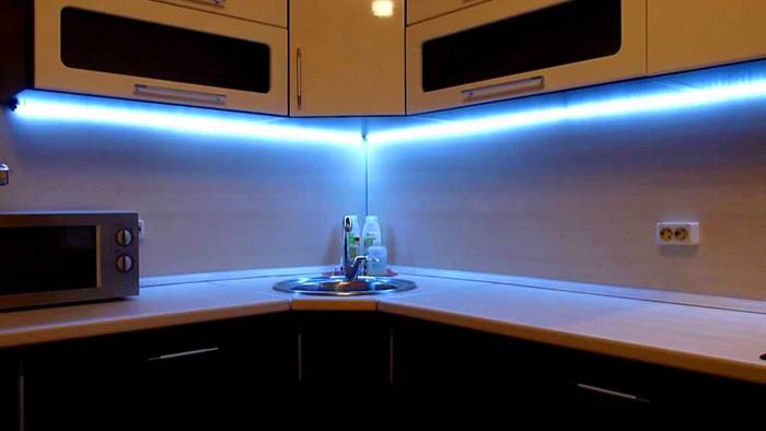 С този метод на осветление можете да отделите работната зона в кухнята. Декоративните светлини се използват за кухненски шкафове и вдлъбнатини на тавана. Лена в долната част на шкафа се използва, когато слушалките стоят на крака. Това създава впечатлението за плаващи шкафове. Осветлението на шкафа отвътре става популярно поради своето удобство и функционалност.