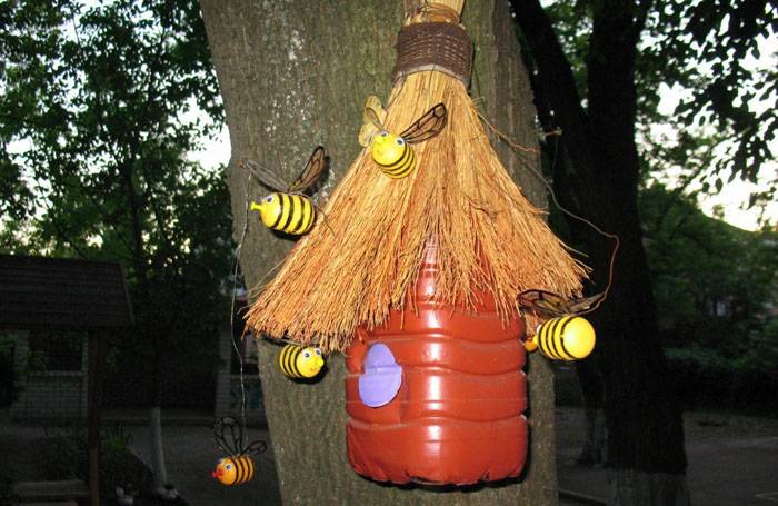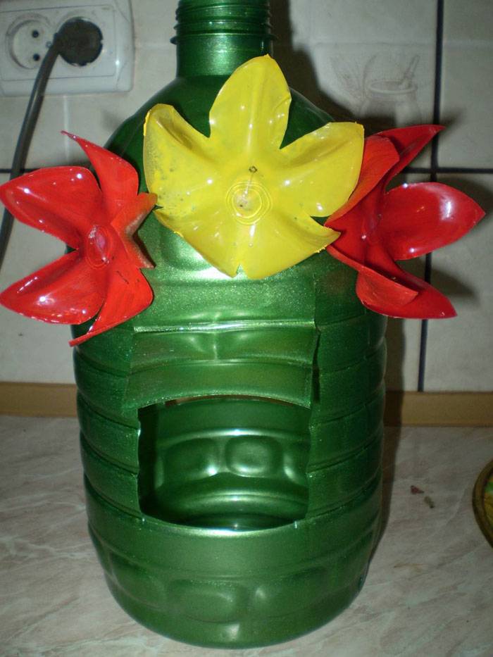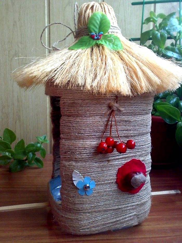 Пластмасата не е най-добрият материал за направата на жилища за птици, но ако няма други възможности, вземете за работа петлитрова бутилка за питейна вода.