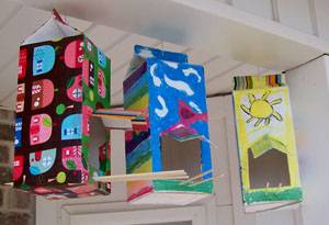 Картонените къщички за птици са продукт за един сезон, не повече и имат по-скоро декоративна функция. За тази цел е по-добре да използвате плътен велпапе, например върху пощенските колети.