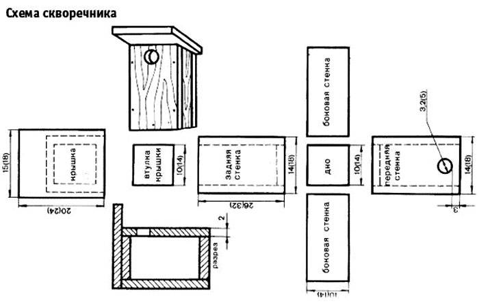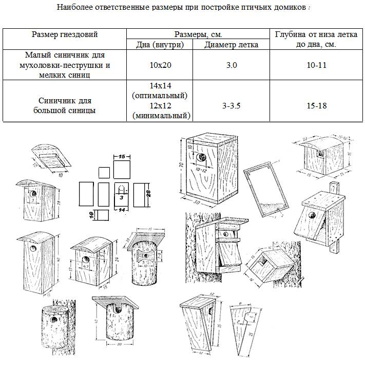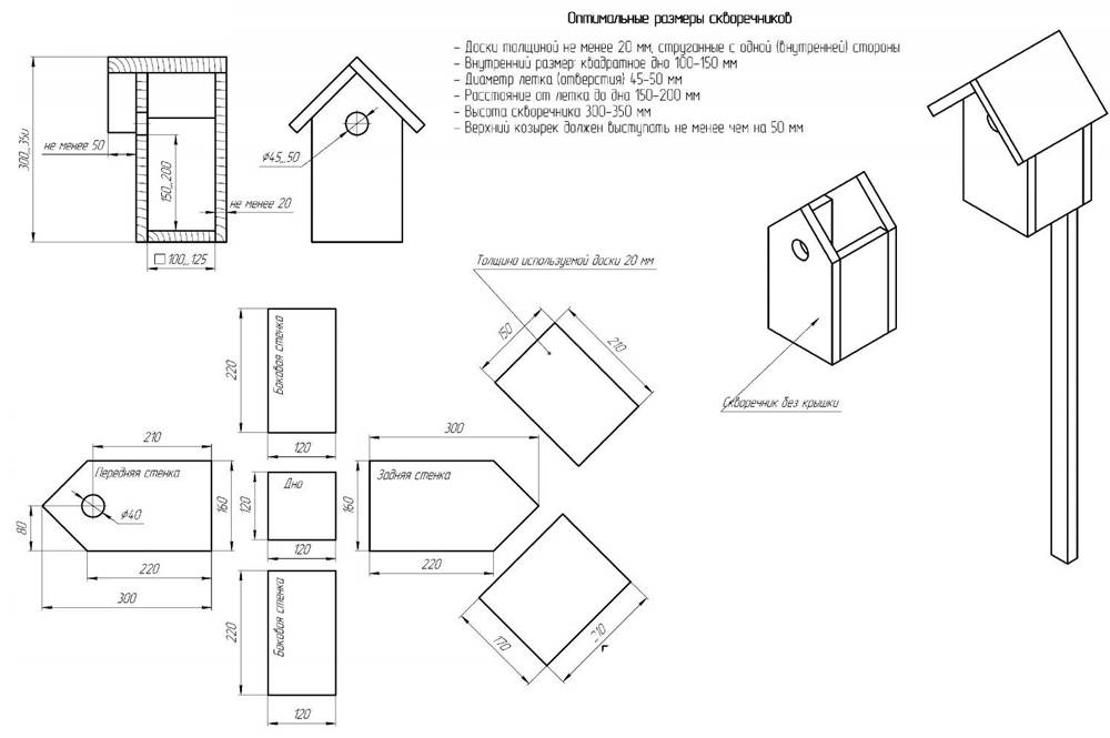Забележка!Всеки вид птици има отделни изисквания за размера и конструкцията на къщата. Ако искате синигери или платна да се настанят в градината, намерете съответните чертежи.