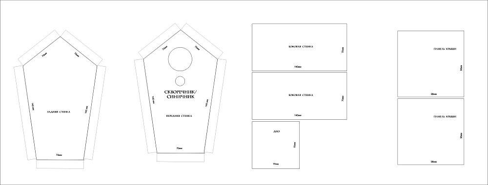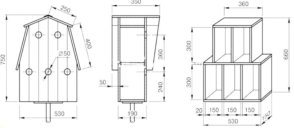 За производството на конструкции от сложни форми можете да изготвите свои собствени чертежи. Основното нещо е да се спазват минималните размери, необходими за обитаване на птици.