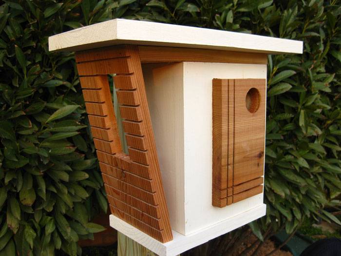 - в предната част на къщичката за птици се изрязва кръгъл или квадратен изрез не по-нисък от пет сантиметра от нивото на покрива. Такава празнина ще бъде достатъчна за птицата, но ще попречи на котката да разруши безпрепятствено гнездото;