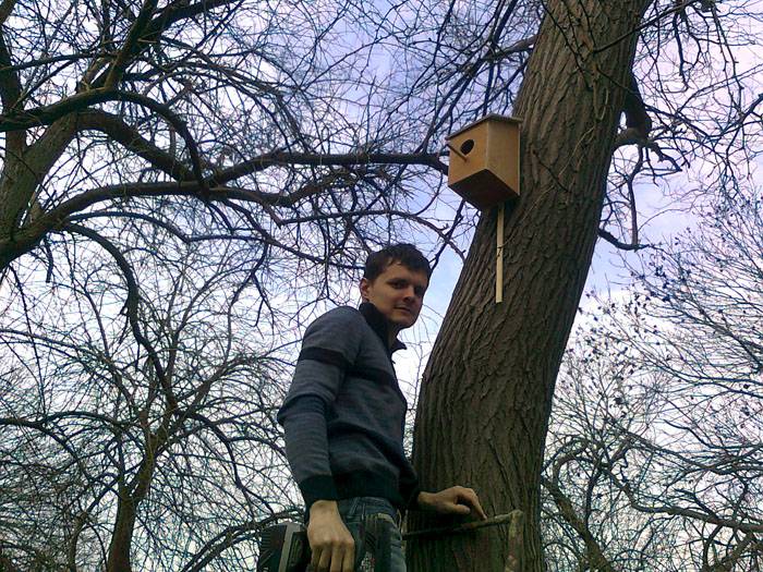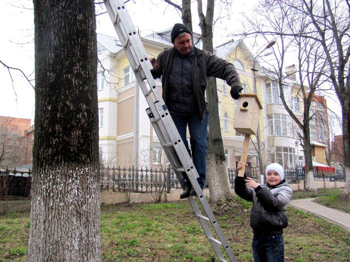 Съвет! Не инсталирайте самостоятелно къщичката за птици, обадете се на помощник. Той ще предаде инструментите и ще държи стълбата.