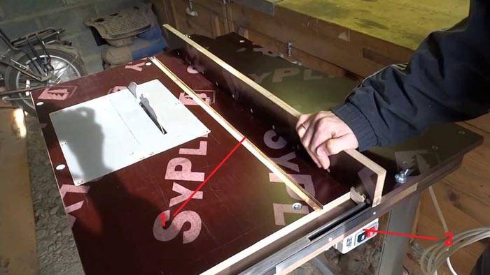 Водач за циркулярен трион със собствените си ръце е създаден с равномерен ръб (1). Превключвателят (2) е монтиран на голямо разстояние от въртящия се диск, за да улесни изключването на двигателя в случай на авария
