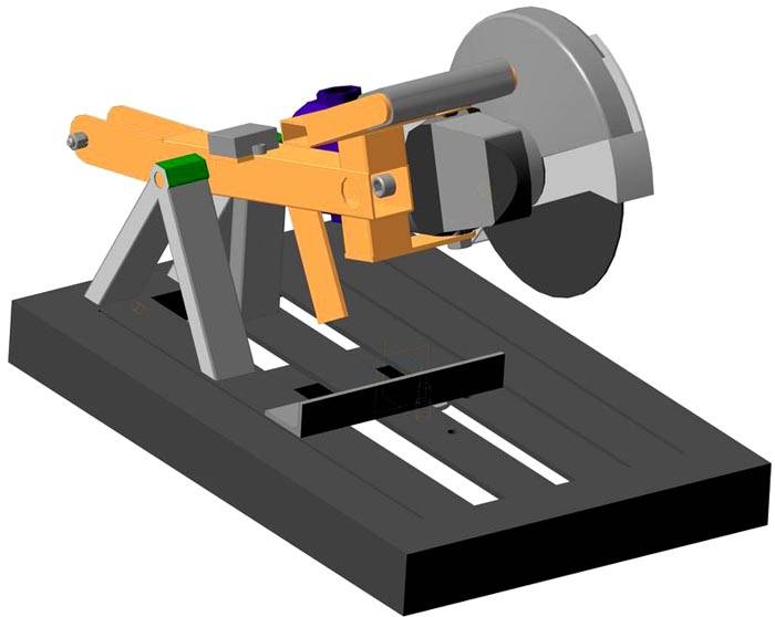 Задвижването с режещия диск е прикрепено към люлеещото рамо. За улесняване на физическите усилия е монтирана пружина или противотежест. Движението на инструмента е допустимо само във вертикална посока по дъгата. Този дизайн е мобилен. Може да се монтира на закрито и на открито върху подходяща основа. Ако е необходимо, мелницата може да бъде демонтирана. Той е закрепен с винтови съединители на амортизиращо дървено (гумено) уплътнение.