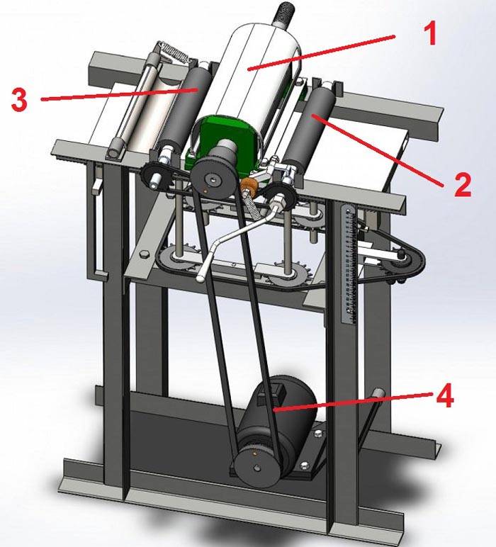 Валът (1) с един или повече ножове се върти от електродвигател (4), две ролки и ремък. За притискане и преместване на детайла тук са монтирани ролки (2, 3) и ръчно задвижване с верижен механизъм. Конструкцията е сглобена върху здрава рамка, направена от стоманени ъгли.