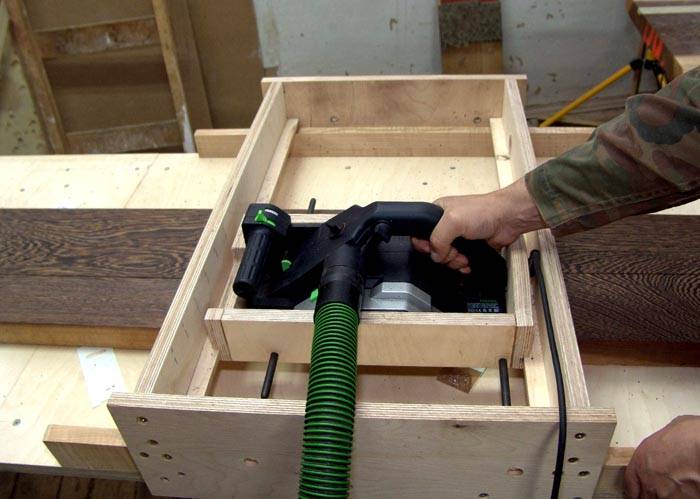 Картината показва, че електрическият инструмент е фиксиран над детайла в специална рамка. Осигурете възможността да го премествате в надлъжна и напречна посока със стриктно запазване на ъгъла между тях 90 °. Модерен самолет е оборудван със специален изход за свързване на прахосмукачка. Следователно няма да има проблеми с изхвърлянето на отпадъци.