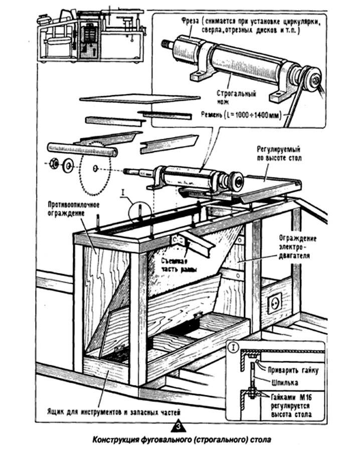 Основната част е леглото (1). Към него са прикрепени други части на продукта. Той осигурява не само целостта на здравината на рамката, но и добра стабилност на повърхността. Дърводелската машина е предназначена за обработка на относително леки детайли, така че тази част може да бъде направена от твърда дървесина.