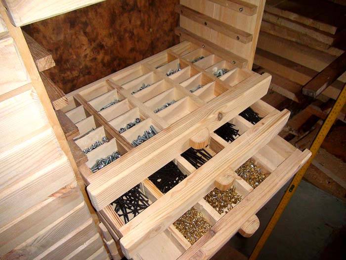 За рационалното използване на свободното пространство са полезни рафтовете за стени и тавани, стелажи, куки и специални държачи. Точното място за инсталиране на съответния аксесоари за дърводелство се избират, като се вземат предвид особеностите на технологичните процеси, разположението на машини и работни маси.