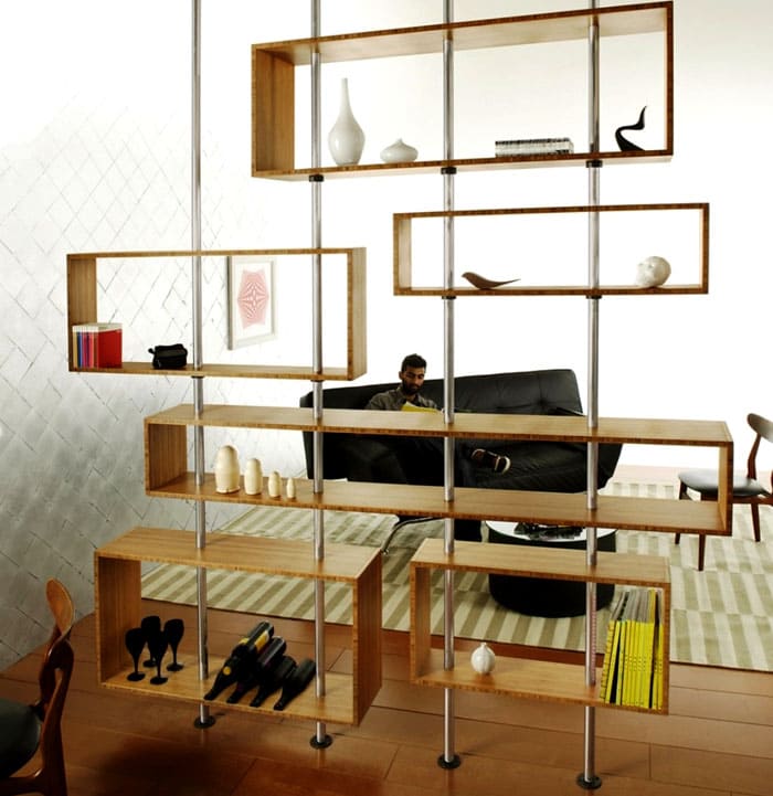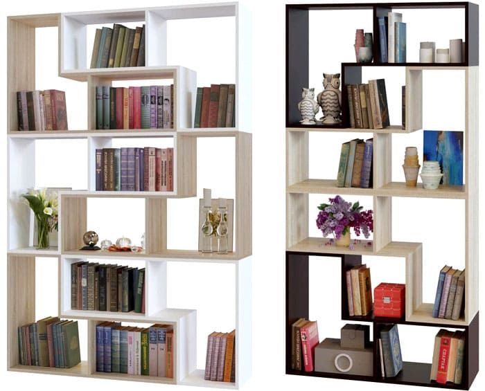 При обсъждането на предимствата на подовите рафтове вече определихме как те могат да се използват. Сега ще разгледаме опциите за местоположението на стелажа като прегради за зониране на стая или като функционална декорация, която можете да закупите за себе си.