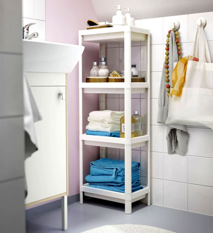В допълнение към естетическите измислици е удобно да съхранявате навитите кърпи, козметика, тоалетна хартия на рафтовете