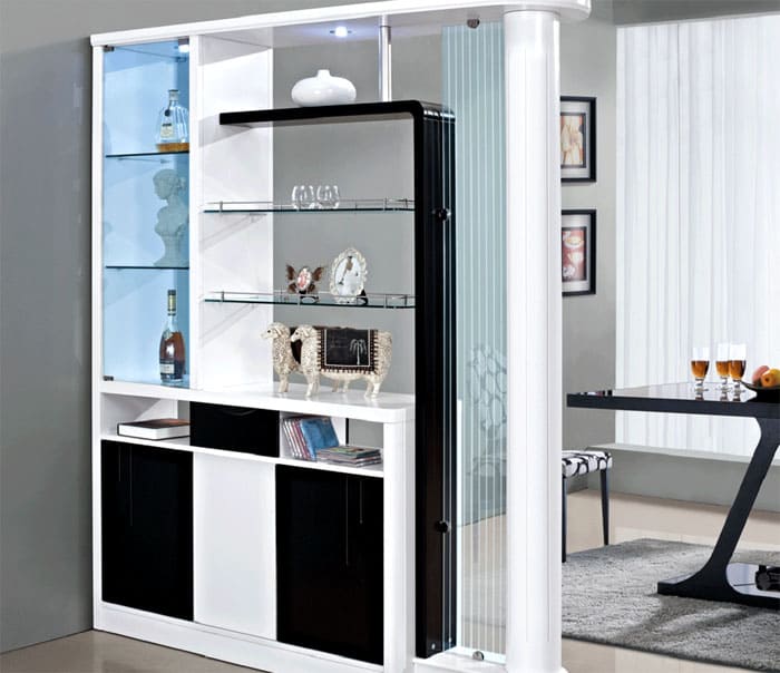 Мобилният дял ще помогне на хората, които често сменят интериора си или се нуждаят от временен екран. Това е дизайн на малки колела. Много е лесно да го преместите, без да повредите съдържанието на рафтовете.