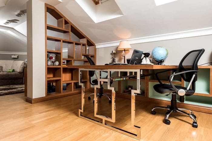Тук идеално ще се поберат не само универсални, но и ъглови модели. Стелажи с шкафове са добре дошли, което ще направи структурата по-функционална