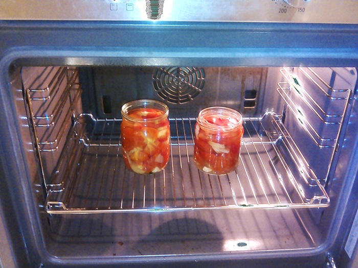 Поставяме всички заготовки в студена фурна върху лист за печене, покривайки с капаци без ластици. Оставяме уреда с бурканите да се затопли, изчакайте 20 минути при 180 ° C. След като извадим консервацията, сменете капаците на други или поставете ластиците в тези капаци. Разклатете леко съдържанието на контейнера, за да освободите въздуха.