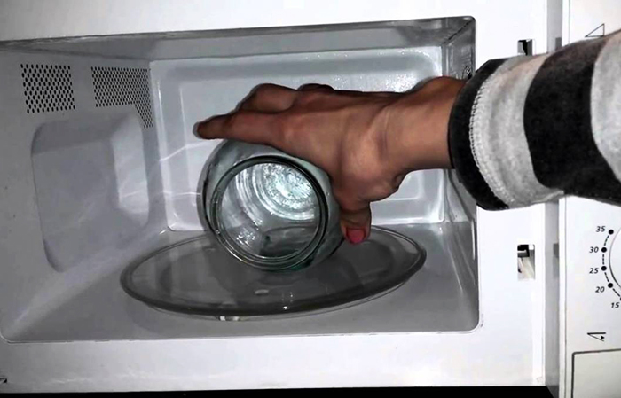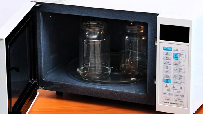 Налейте вода във всеки буркан, около 2 см. Ако това не бъде направено, те могат да се спукат. Сега поставяме контейнера върху съда в микровълновата печка. При 900 W са достатъчни само три минути.
