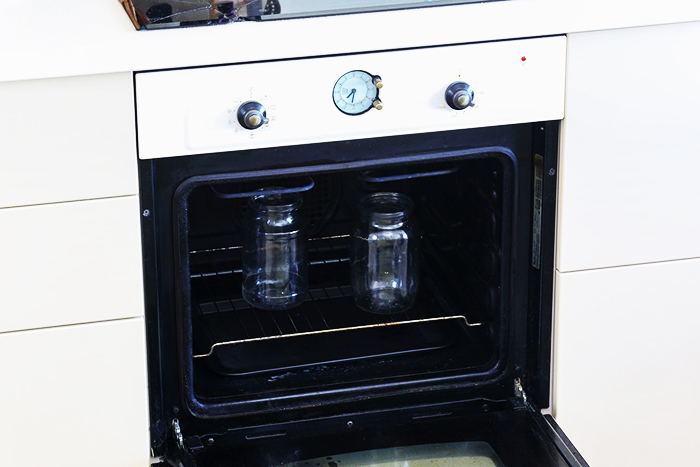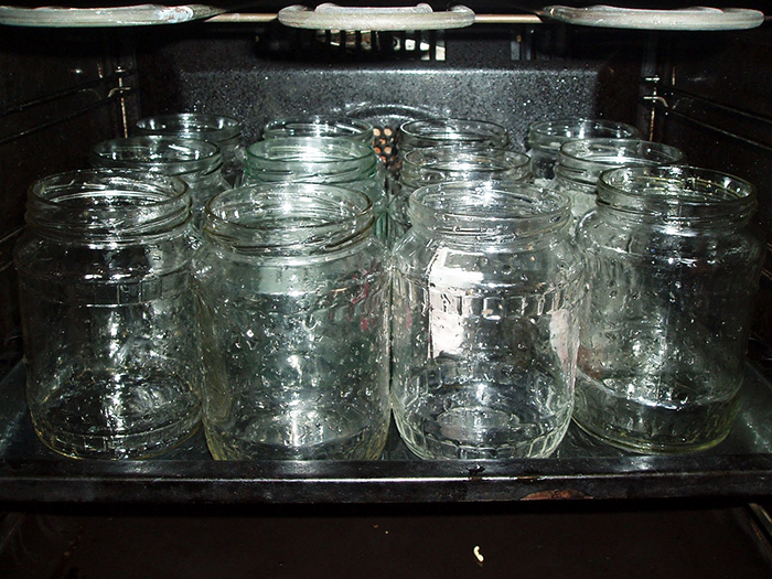 Чистите буркани трябва да се поставят с гърлото надолу върху лист за печене или решетка в студена фурна.