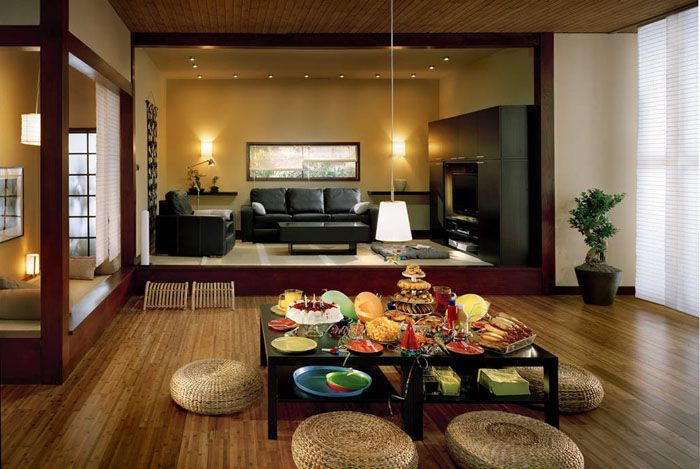 Интериорът е базиран на светло дърво.Това се отнася не само за декорация и мебели, но дори и за завеси, изобразяващи бамбук. Като цяло говоренето за японски стил е едновременно просто и трудно. Ето защо е по-добре да погледнете снимката и да разберете как правилно да организирате пространството и как да го украсите.