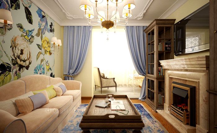 Всъщност това е стилизация на стаята, която използва стари училища. Но има и функция - умереност във всичко. Ето защо, чифт масивни фотьойли, кадифена тапицерия, дървени рамки за огледала, свещници, тапети по стените с геометрични шарки - всичко това е ретро стил в интериора на стаите на апартамента.