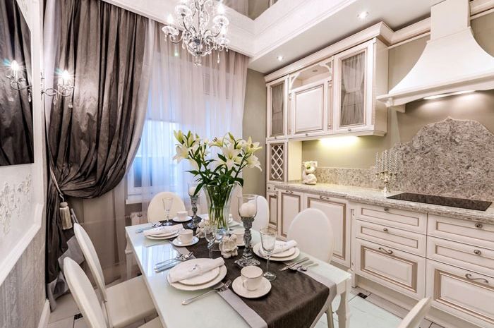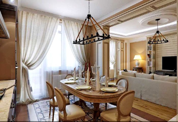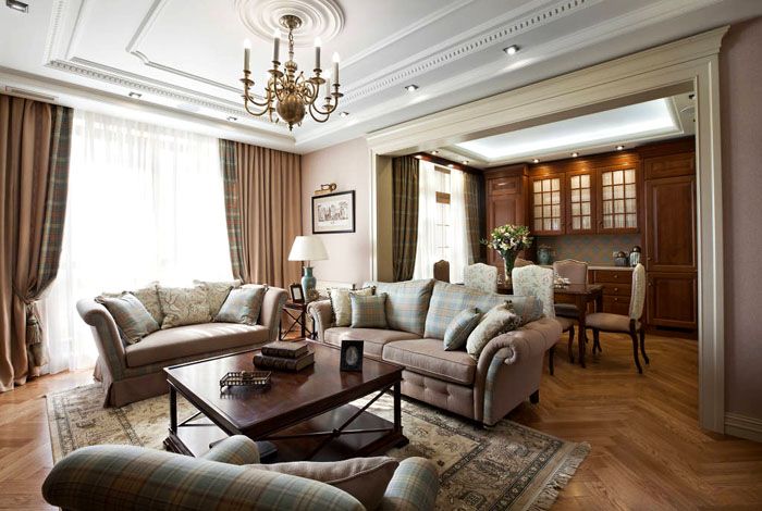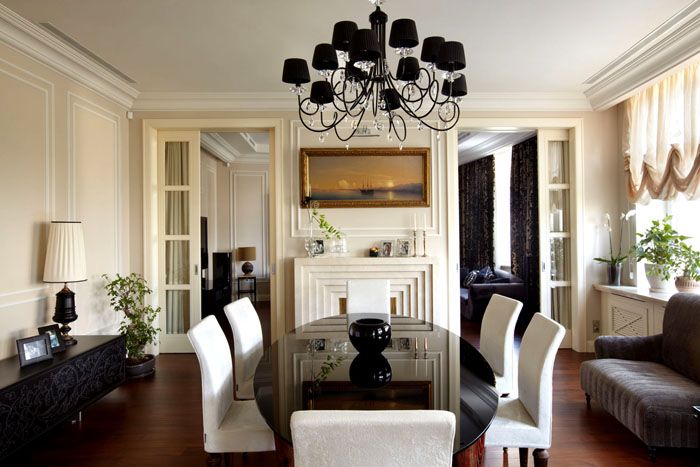 Но, както беше отбелязано по-горе, класиката има един важен аспект, който ще трябва да се поддържа както в апартамент, така и в огромна частна къща. Това е пространство. Не можете да запълвате помещенията заради изискванията за стил, особено ако в стаята няма достатъчно място.По-добре е да намалите количеството мебели, аксесоари, архитектурни форми, но играйте с цвят, осветление, завеси и други елементи. И няма да е трудно да направите това, защото класическият стил е един от малкото, който се адаптира към различните възможности на стаята.