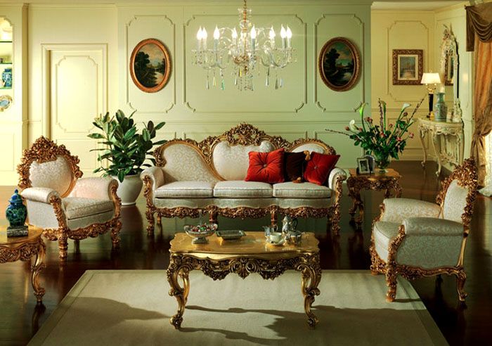 - Естествени мебели с резби и елементи от злато и слонова кост. Мека мебел присъства, но не много от нея.