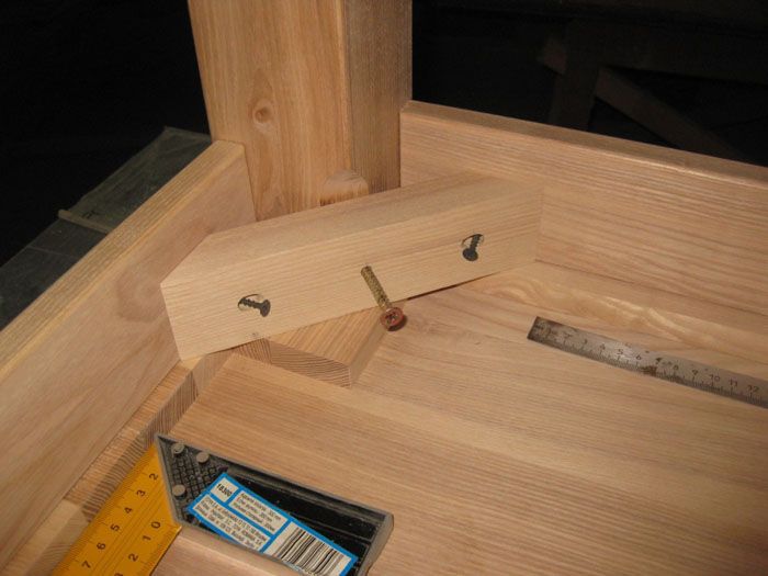 Веднага след като кракът е фиксиран, ъгълът веднага се проверява: не трябва да има отклонение от 90 °. Операцията се повтаря с други крака. Можете да прикрепите краката директно през плота, но това ще повлияе на естетическия компонент на продукта.