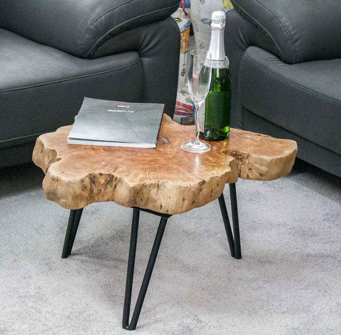 Ако вземете метални крака и трион, отрязан от голямо дърво, можете да добавите интересен обрат към хола. Това не е най-трудният вариант за направата на маса.