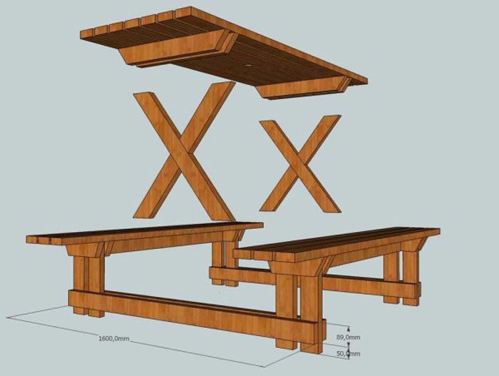 - За да направите кръстовидните крака, трябва да вземете две дъски и да ги пресечете, така че между краищата им да има 64,5 см. По-добре е да маркирате пресечната точка с обикновен молив. За да се свържете, трябва да създадете жлеб: дебелината на дъската е наполовина до размера на втората дъска. Същият жлеб е необходим на друга дъска. Трябва да поправите всичко с четири гвоздея. Краката са прикрепени към пейките, като се изчислява еднакво разстояние от всяка. Сглобените кръстосани елементи са прикрепени към плота на масата.