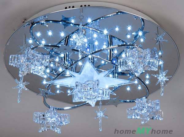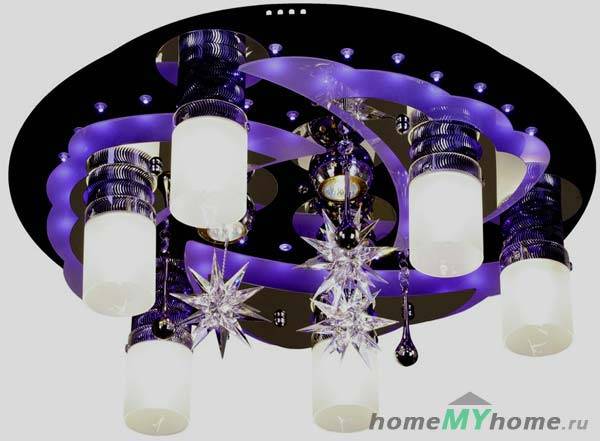 LED полилеи за таван за частна къща с дистанционно управление могат да се използват във всяка стая, включително спалня и детска стая... Включването и изключването се извършва с помощта на дистанционното управление или фиксиран прекъсвач, а настройката и настройката се извършват с помощта на "мързелив".