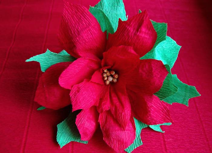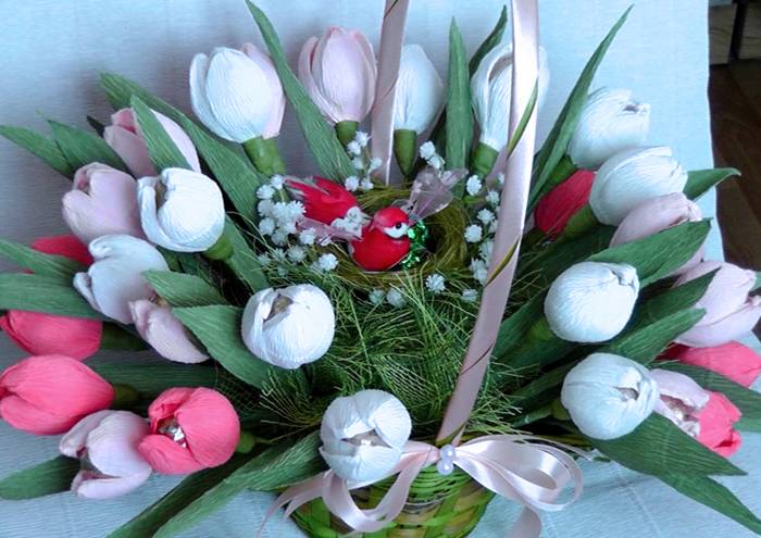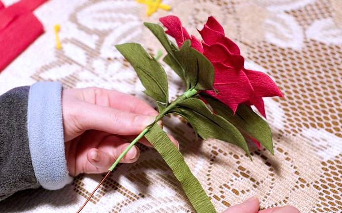 - Цветето се събира на централно стъбло, всяко ниво се фиксира с лента хартия и лепило. Отдолу - зелени листа, отгоре - пет червени или жълти.