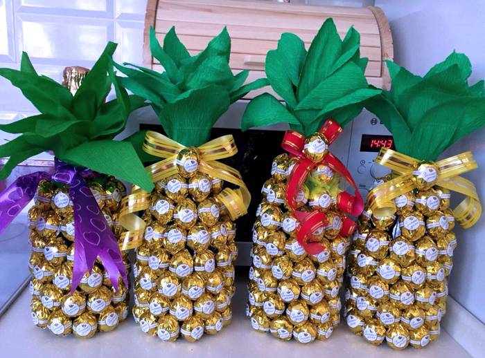 Листата на ананаса се изрязват от гофрирана хартия - около 5 парчета, колкото е възможно повече. Листата просто се вкарват в гърлото на бутилката, а кръглите бонбони се залепват с пистолет за лепило по обиколката на контейнера.