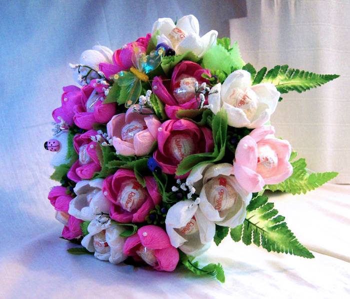В друга версия на направата на цветя от гофрирана хартия със бонбони със собствените си ръце, сладостта е вградена в центъра на всяко цвете. Това е по-старателна работа, която изисква търпение и точност. Бонбонът ще действа като основа за сглобяване на венчелистчетата. Но такъв букет, особено направен със собствена ръка, ще бъде просто безценен.