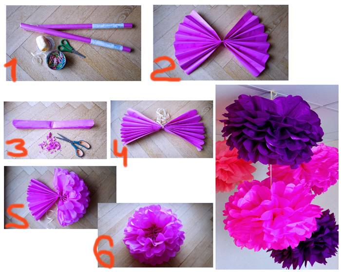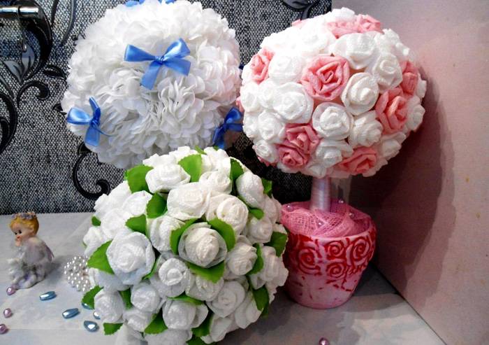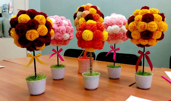 Цветята се правят по един от описаните по-горе методи: рози, карамфили, шипки. След това съцветията се залепват към пяната. В интервалите между цветята можете да залепите мъниста или листа от една и съща гофрировка. Топката се поставя върху цев, увита в сатенена панделка или гофриране. Цялата конструкция е фиксирана в саксия за цветя.
