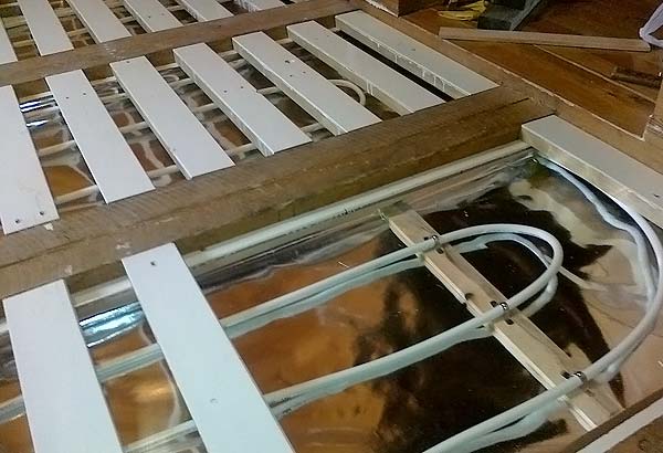 За полагане на нагревателните елементи са необходими водачи. Като такива могат да се използват канали в дъски или специални алуминиеви елементи - щамповани плочи. Първите са по-малко за предпочитане, тъй като процесът на изрязването им е сложен и трудоемък, и топлопроводимост на дървото изключително ниско, тоест подът ще бъде леко нагрят.