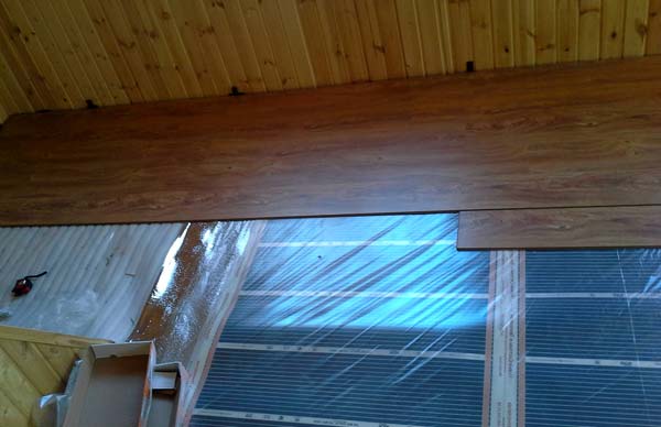 Под ламината са положени топли подове в дървена къща, сега е необходимо да се постави ламинатът. Този тип покритие няма много добра топлопроводимост, но при инсталиране на подово отопление с дървена основа е най-приемливо. Основата е заварена мрежа, върху която се полага субстратен слой. Ламинирани дъски имат висока якост и плътност, така че дори без бетонна замазка, такъв под ще бъде надежден и издръжлив.