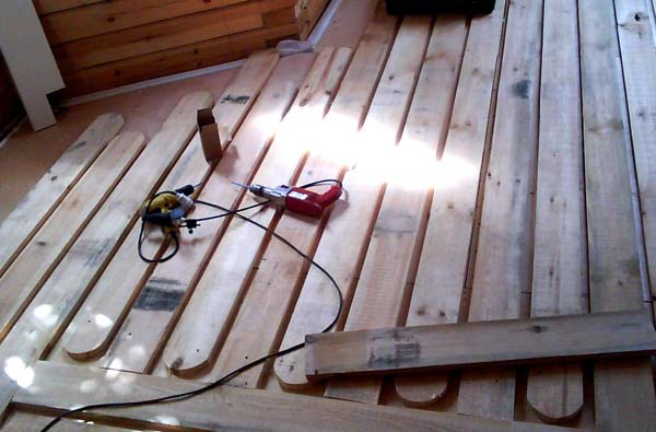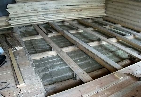 Монтажът трябва да се извършва на подготвена основа, която е предварително изолирана и изолирана от влага. За да направите това, старото покритие и подови настилки от дъските са напълно премахнати, остават само трупите, които трябва да имат стъпка от най-малко 60 см, в противен случай ще трябва да се монтират допълнителни греди. Подовите дъски трябва да бъдат с еднаква дебелина, така че те са предварително обработени машинен инструмент или заменена със стандартна подова дъска.