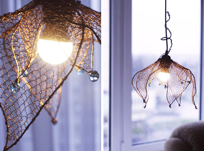 โคมไฟที่ทำด้วยตัวเองที่ทำจากสายไฟสำหรับโคมระย้าเป็นงานที่ค่อนข้างลำบาก คุณไม่สามารถทำได้หากไม่มีทักษะในการทอผ้าและถัก โคมไฟรุ่นดังกล่าวมักใช้สำหรับโคมไฟระย้าบนเพดานหรือโคมไฟตั้งโต๊ะ
