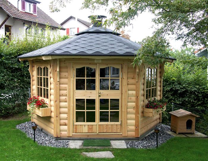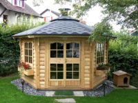 ศาลาเพิ่มเติมสามารถแบ่งตามรูปร่างของโครงสร้าง ที่นิยมมากที่สุดในหมู่เจ้าของกระท่อมฤดูร้อนคือแบบจำลองดังกล่าว