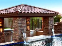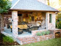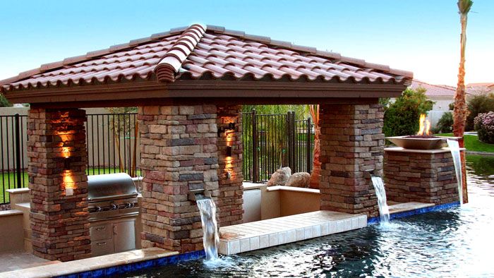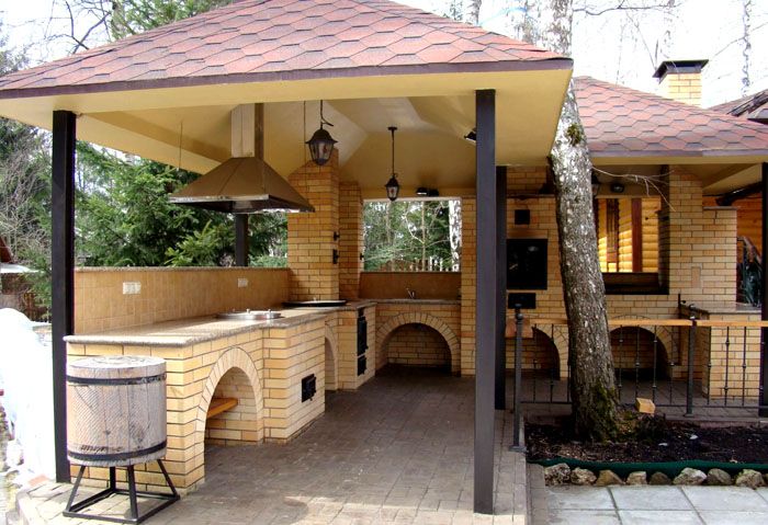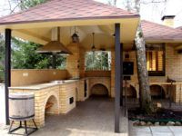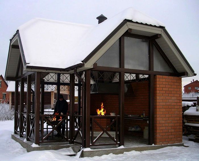 ถ้าศาลาสร้างด้วยอิฐแบบเดียวกับบ้านและมีการตกแต่งแบบเดียวกันมันจะดูเหมือนเป็นส่วนเสริมที่มีเหตุผลสำหรับกลุ่มสถาปัตยกรรม ศาลาดังกล่าวมั่นคงและเชื่อถือได้จะคงอยู่ไปอีกหลายทศวรรษ อาคารดังกล่าวสามารถรองรับเตาอั้งโล่เตาอบของรัสเซียบาร์บีคิวหรือเตาอบที่ซับซ้อนได้อย่างปลอดภัย บ้านสูบบุหรี่tandoor และอุปกรณ์อื่น ๆ