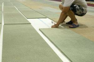 - ปูพื้น การพูดนานน่าเบื่อสำเร็จรูปแบบแห้ง "พื้นลอย" และพื้นยกทำจากแผ่นไม้อัดร่องสำหรับพื้น ด้วยความช่วยเหลือของมันทำให้การปูสนามกีฬาสนามเทนนิสและโพเดียมแข็งแรงขึ้นด้วย