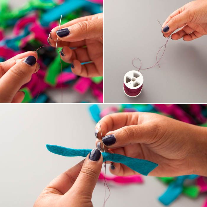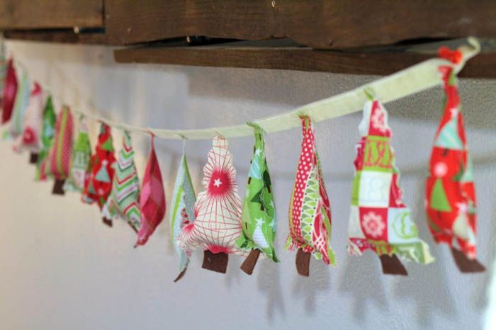 เราตัดรูปร่างของต้นคริสต์มาสออกจากผ้าเย็บขอบบนเครื่องพิมพ์ดีดออกจากที่สำหรับใส่ไส้ เราเปิดผลิตภัณฑ์ออกเติมด้วยสำลีซับโพลีเอสเตอร์ชิ้นส่วนของผ้าและเย็บด้วยตะเข็บตาบอด เราเย็บต้นไม้แต่ละต้นเพื่อถักเปียด้วยมงกุฎ